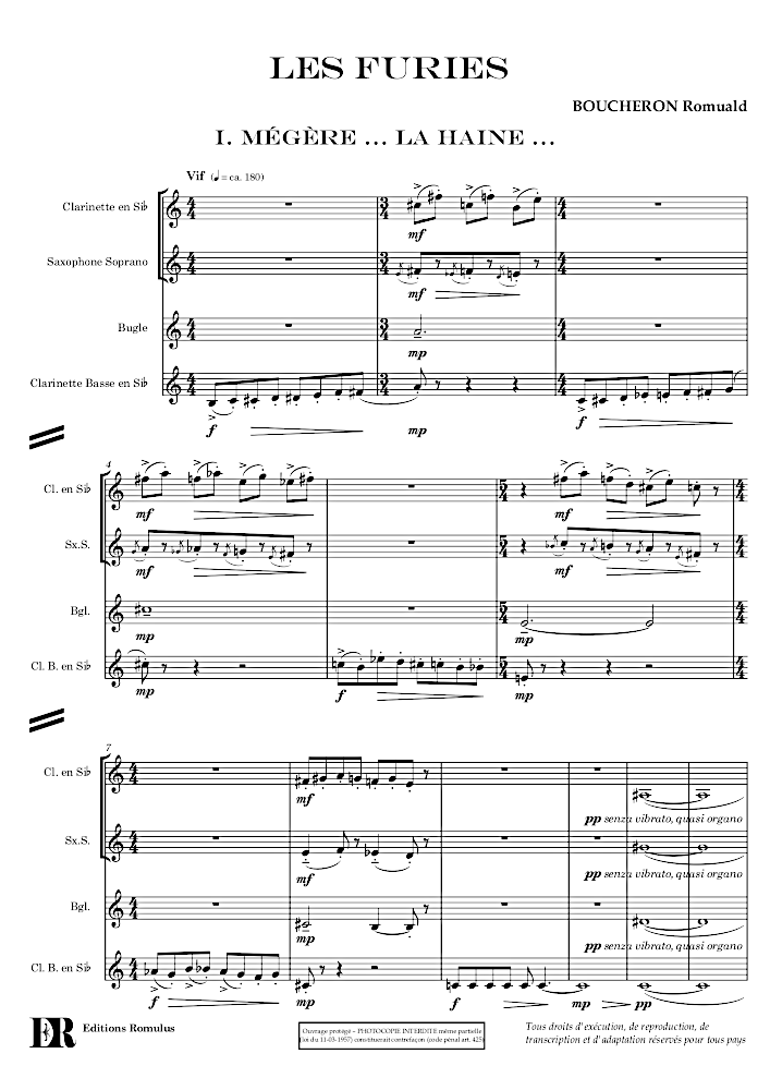 La même pièce que la précédent mais pour Quatuor de Clarinettes (2 Clarinettes Bb, Cor de Basset, Clarinette Basse Bb)