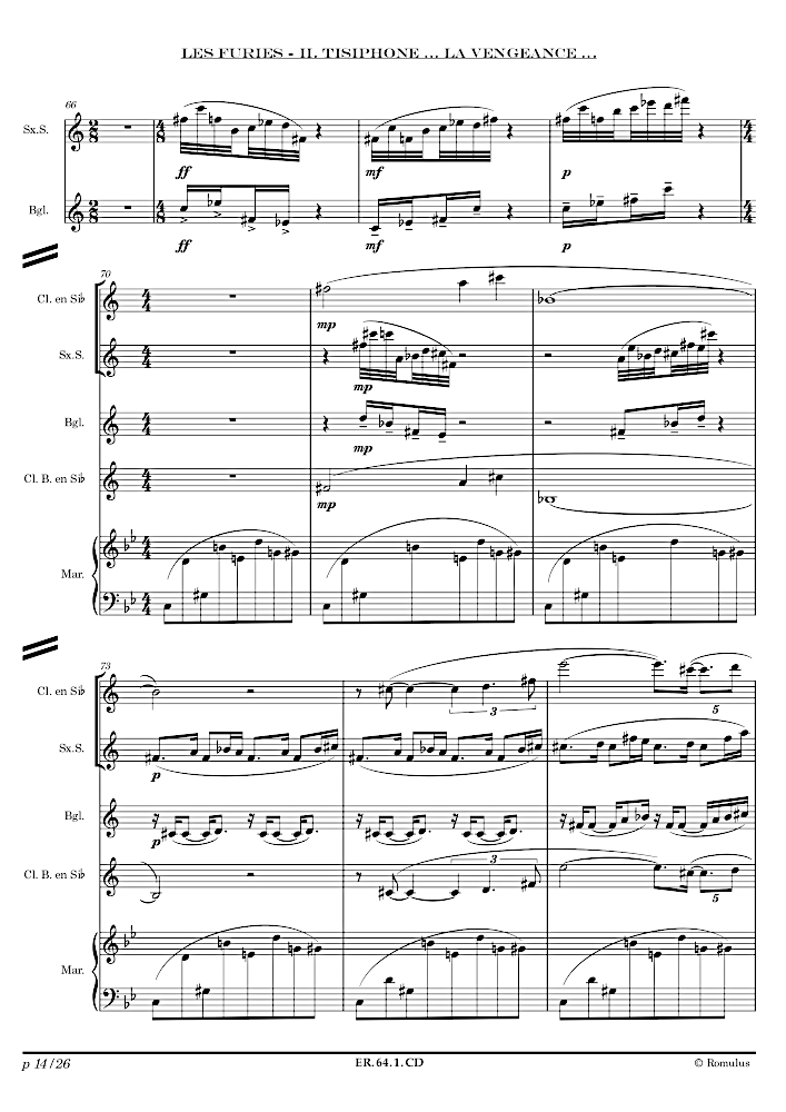 3 pièces pour Clarinette, Clarinette Basse, Bugle, Saxophone soprano et Marimba.